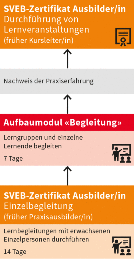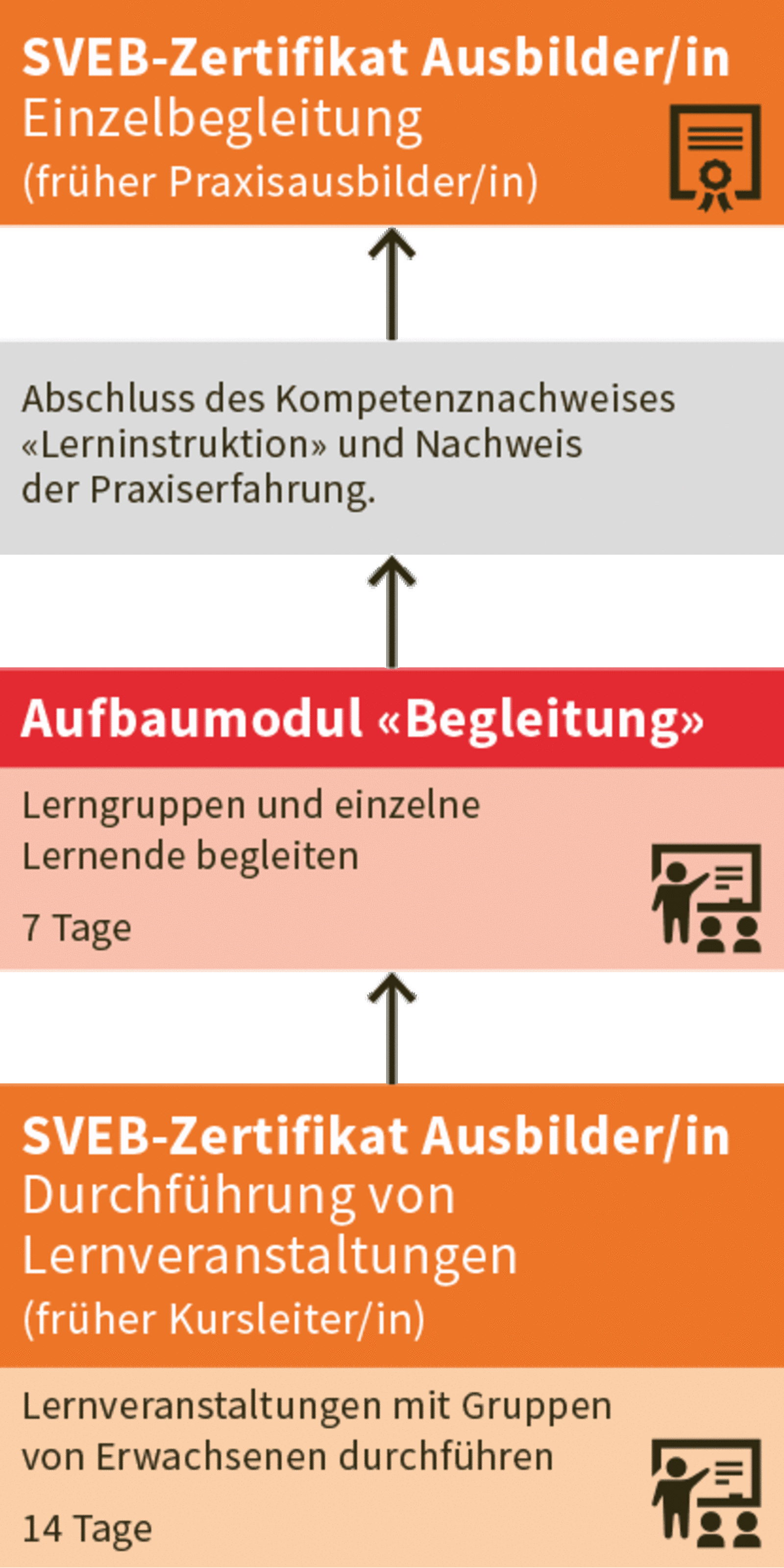 Nach dem Erhalt des SVEB-Zertifikats «Ausbilder/in – Einzelbegleitung» können Sie auch noch das SVEB-Zertifikat «Ausbilder/in – Durchführung von Lernveranstaltungen» erwerben. Dazu müssen Sie folgenden Weg einschlagen: